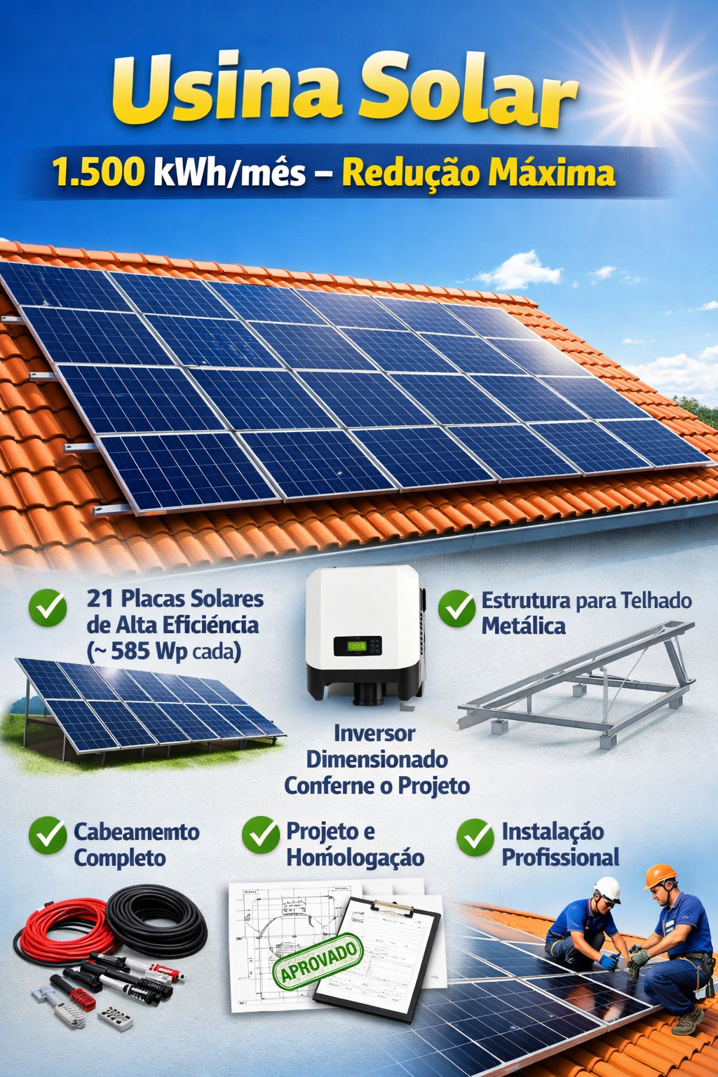 ✔ 21 placas solares de alta eficiência (≈ 585 Wp cada) — total aproximado de 12,3 kWp