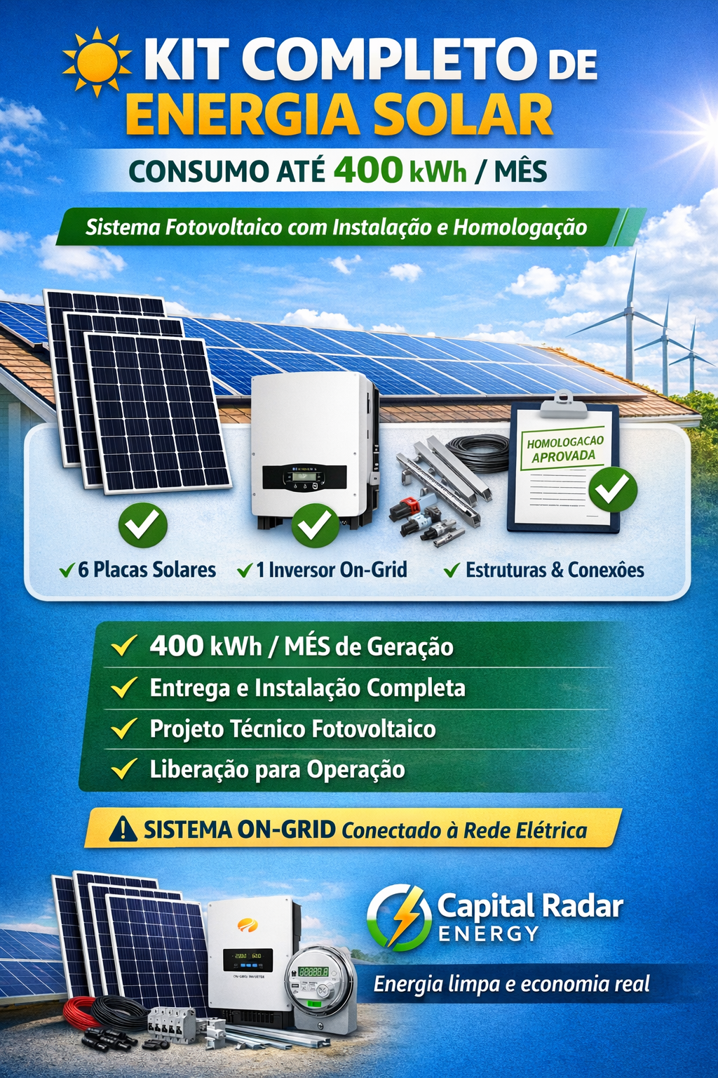 A Usina Solar 400 kWh/mês – Redução Máxima é a solução ideal para quem busca economia real, tecnologia confiável e retorno de longo prazo, com um sistema robusto e totalmente regularizado.