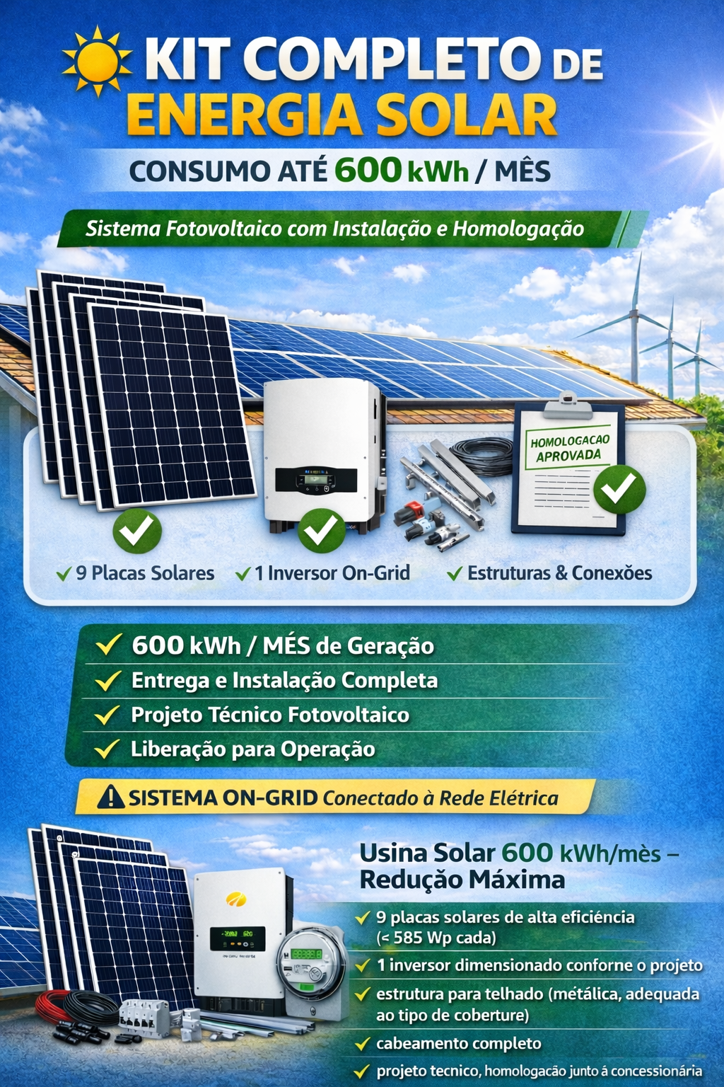 A Usina Solar 600 kWh/mês – Redução Máxima é a solução ideal para quem busca economia real, tecnologia confiável e retorno de longo prazo, com um sistema robusto e totalmente regularizado.