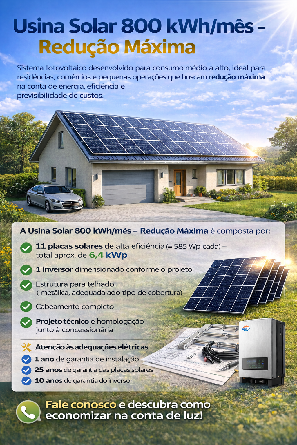 A Usina Solar 800 kWh/mês – Redução Máxima é a solução ideal para quem busca economia real, tecnologia confiável e retorno de longo prazo, com um sistema robusto e totalmente regularizado.